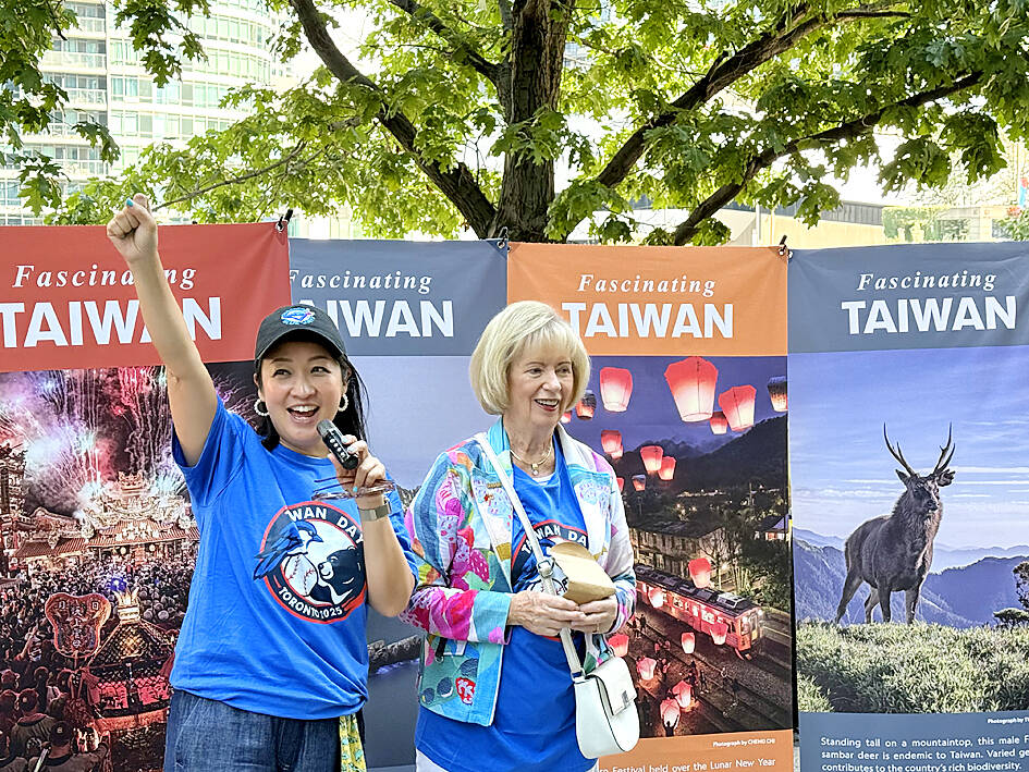 Canadian lawmaker Judy Sgro, cochair of the Canada-Taiwan Parliamentary Friendship Group, joined the crowd, along with Taipei Economic and Cultural Office in Toronto Director-General Liang Yi-peng (梁毅鵬) and Toronto City Councilor Lily Cheng (陳伶俐), the daughter of Taiwanese immigrants.