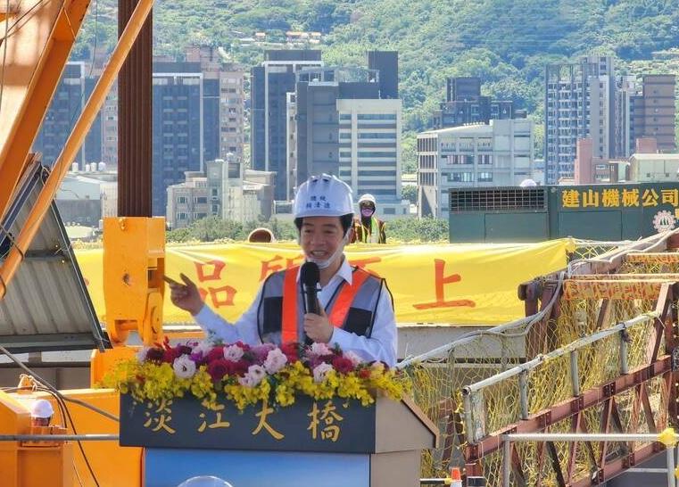 President William Lai (賴清德) today oversaw the installation of the final prefabricated segment of the new Danjiang Bridge (淡江大橋) in New Taipei City’s Tamsui District (淡水).