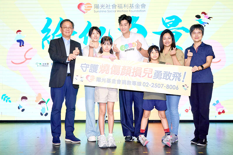 Singer Eric Chou, center, attends a news conference yesterday organized by the Sunshine Social Welfare Foundation, a nongovernmental group that supports burn survivors with scars or disfigurements. Chou called for public donations to help children with burn scars access comprehensive physical rehabilitation and psychological services.