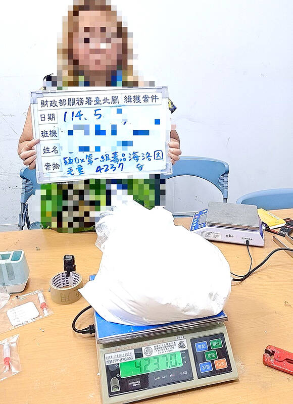 Customs officers at Taiwan Taoyuan International Airport discovered 4.237kg of heroin hidden in her luggage in May, worth an estimated NT$30 million (US$997,838), Chen Po-chuan (陳博全), captain of the bureau’s Second Investigation Team, said in a joint media interview.