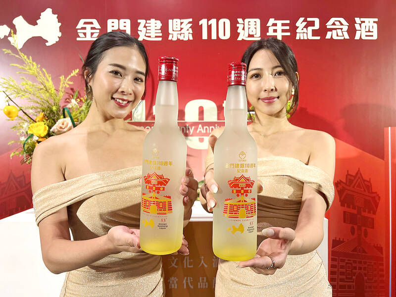 Two models display bottles of kaoliang liquor at an event hosted by Kinmen Kaoliang Liquor Inc in Kinmen yesterday. The featured bottle isto be officially launched by the end of the year to celebrate the 110th anniversary of Kinmen being formally established as an administrativecounty.