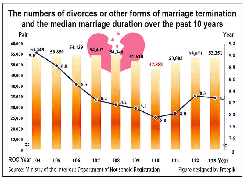More than 53,000 couples divorced last year, half of whom were married less than nine years, Ministry of the Interior data released yesterday showed.