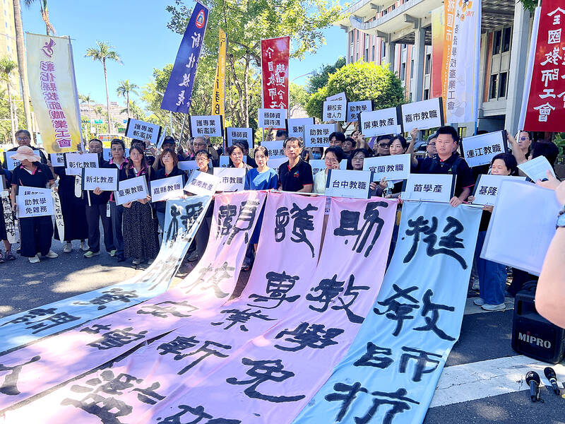 Teachers and teachers-in-training yesterday protested in front of the Ministry of Education in Taipei, saying that frivolous litigation and administrative duties are depriving the education sector of much-needed talent.