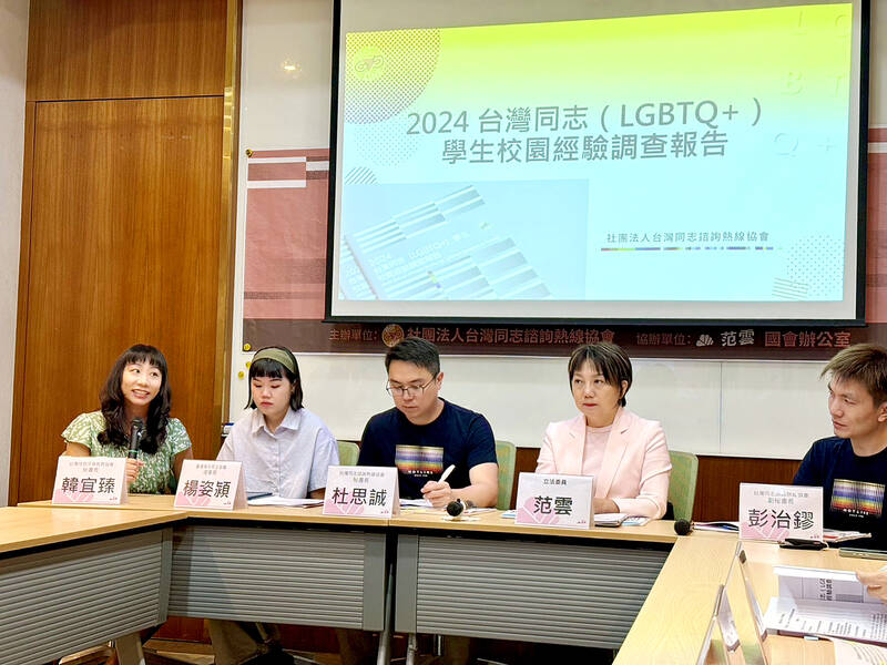 At a news conference cohosted by the Taiwan Tongzhi Hotline Association at the legislature in Taipei, Fan said that the Ministry of Education should make nondiscrimination against LGBTQ+ students a core part of teacher training.