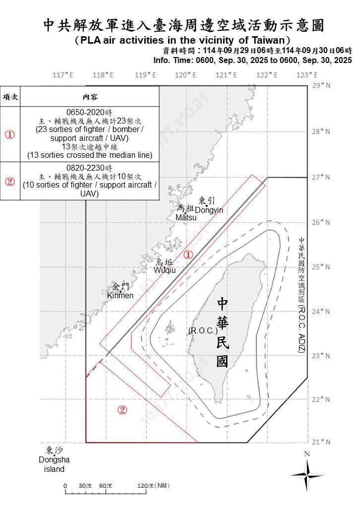 Twenty-three Chinese military aircraft crossed the median line of the Taiwan Strait and entered Taiwan’s northern, central and southwestern air defense identification zones, it said.