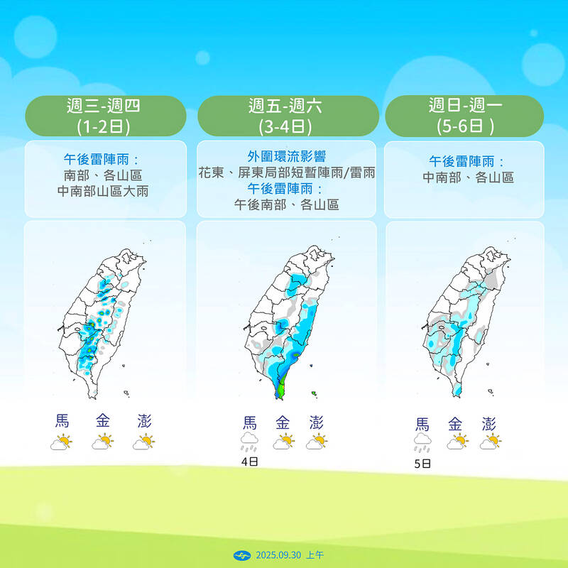 Lin added that southern Taiwan and mountainous areas will see short thundershowers in the afternoon today and tomorrow, and heavy rain is possible in mountainous areas in central and southern Taiwan.