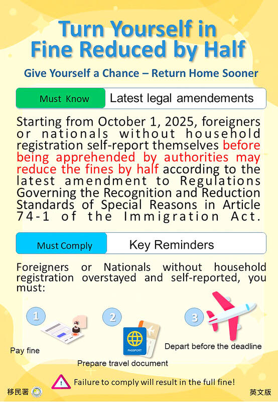 Under the new “Turn Yourself in, Fine Reduced by Half: Give Yourself a Chance — Return Home Sooner” initiative, the National Immigration Agency would reduce fines of between NT$10,000 and NT$50,000 by half, to NT$5,000 to NT$25,000.