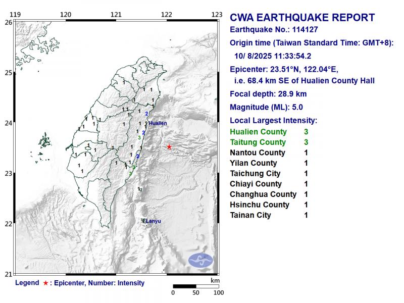 The latest quake, measuring magnitude 5, occurred at 11:33am, with its epicenter located 68.4km southeast of Hualien County Hall at a depth of 28.9km.