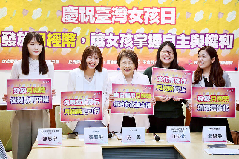 Advocates and Democratic Progressive Party (DPP) lawmakers yesterday urged the government to issue a “period coin” to help young girls buy sanitary products, ahead of Taiwan Girls’ Day tomorrow.