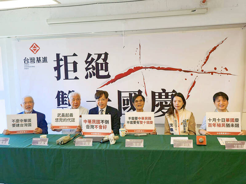 Double Ten National Day signifies the imposition of the Republic of China (ROC) foreign regime by the Chinese Nationalist Party (KMT) when it took over Taiwan by military force, putting the land under colonial rule, Taiwan Statebuilding Party Chairman Wang Hsing-huan (王興煥) told the news conference, which was attended by representatives of the World United Formosans for Independence, the Green Party Taiwan, the Taiwan Obasang Political Equality Party and the Taiwan Nation Alliance, as well as former Democratic Progressive Party (DPP) chairman Yao Chia-wen (姚嘉文).