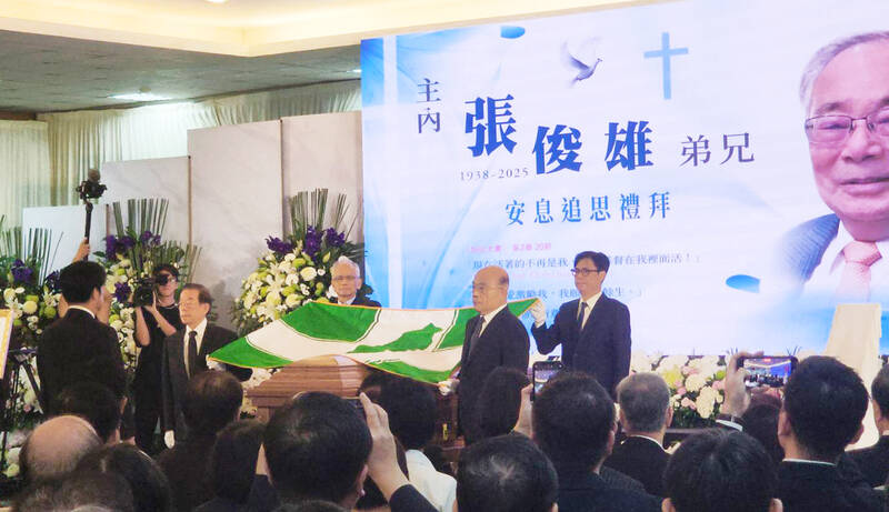 From second left, former premiers Frank Hsieh, You Si-kun and Su Tseng-chang, as well as Kaohsiung Mayor Chen Chi-mai prepare to place a Democratic Progressive Party flag over the casket of former premier Chang Chun-hsiung during a memorial service at the municipal funeral parlor in Kaohsiung yesterday as President William, left, looks on. Chang, who served as premier twice, from October 2000 to February 2002 and from May 2007 to May 2008, under then-president Chen Shui-bian, died on Sept. 27. He was 87.