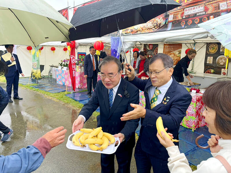 Deputy Minister of Agriculture Hu Jong-i (胡忠一) attended the fair’s opening ceremony to promote Taiwanese seasonal fruits such as pomelos, bananas and dragon fruits, and pork dishes such as sausages, meat ball soup and pork chops.