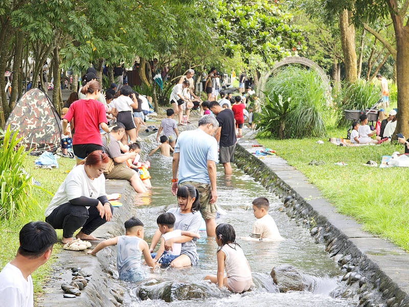 Adults accompany children at a water canal at the Linhousilin Forest Park in Pingtung County yesterday, the last day of the three-day National Day long weekend. The Central Weather Administration said that the hot weather would continue this week, although temperature highs could drop by about 5°C from Sunday next week — with highs of 28°C to 30°C and lows of 22°C to 24°C in northern and northeastern parts of Taiwan, and highs of 30°C to 33°C and lows of 25°C to 26°C in other areas — as the northeasterly monsoon strengthens.