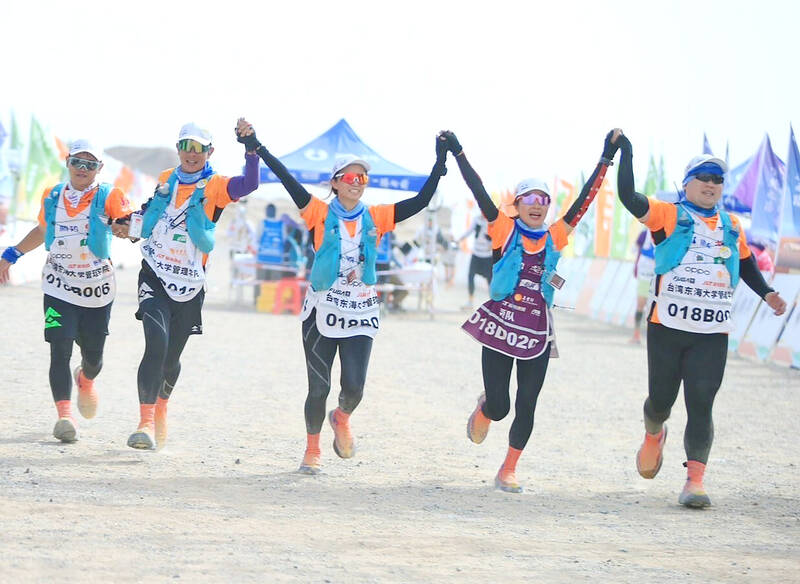 Business students from Tunghai University on Thursday last week cross the finish line in Dunhuang, China, in the Ultra Gobi A, a four-day, 121km team run. A record 70 students from the university competed in the race this year, winning four awards, the university said yesterday. It was the 11th year in a row that students from the university had participated in the race, one of five in the Ultra Gobi Series.
