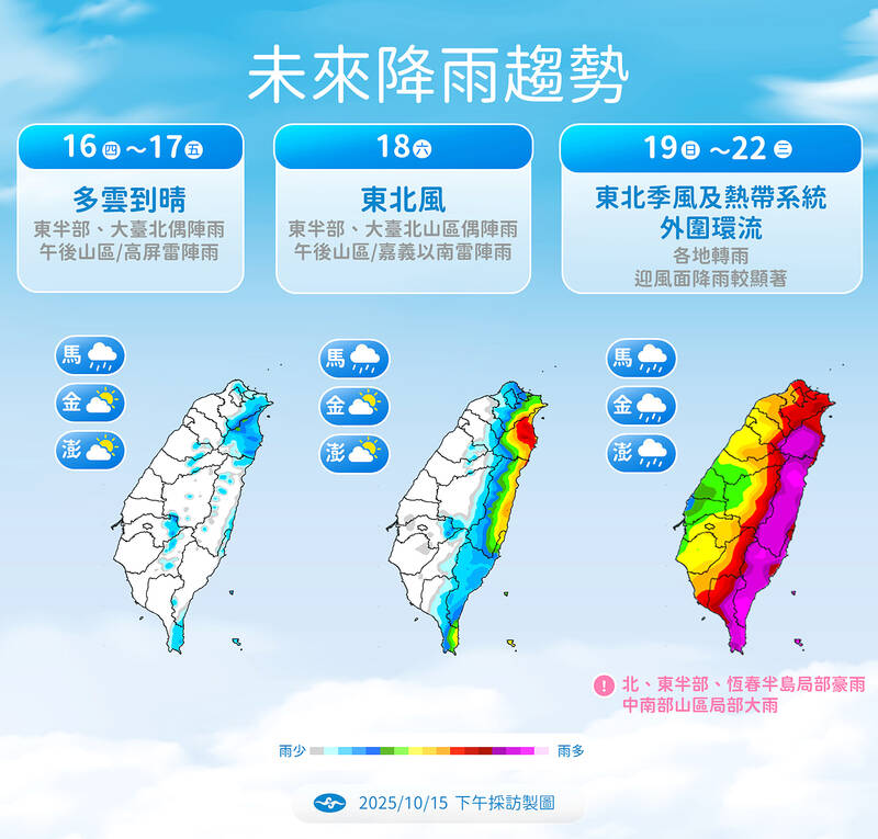 Northern and eastern Taiwan are expected to experience cooler weather and heavy rain from Sunday to Tuesday next week, as the northeast monsoon moves southward, independent meteorologist Wu Der-rong (吳德榮) said yesterday.