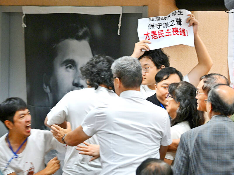 A scuffle erupted yesterday at a memorial organized by the Formosa Republican Association for an assassinated US conservative speaker that prompted a small protest at National Taiwan University.