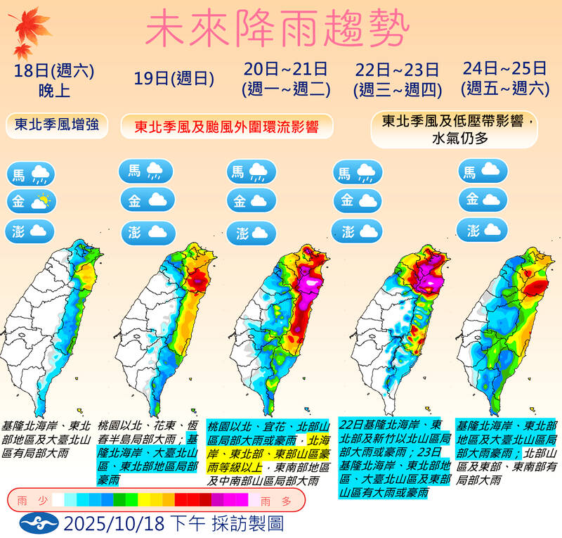 People in northern and eastern Taiwan should be on alert for potential disasters caused by significant rainfall through Wednesday, independent meteorologist Daniel Wu (吳德榮) said. Driven by seasonal northeasterly winds and Tropical Storm Fengshen south of Taiwan, the heavy rain is likely to hit northern mountainous regions and northeastern Taiwan the hardest, while residents in Hualien and Taitung counties should also remain on alert, Wu said. As of 2pm yesterday, Fengshen was about 1,130km southeast of Oluanpi (鵝鑾鼻), Taiwan’s southernmost point, moving northwest at 27km per hour toward China’s Hainan Island, and was not expected to directly affect Taiwan, the Central Weather Administration (CWA) said. Daytime highs yesterday ranged between 33°C and 35°C in western Taiwan, and 31°C to 32°C in eastern Taiwan, the CWA said. Temperatures in northern Taiwan would gradually decline during the week through Wednesday, dropping to about 20°C, Wu said. Meanwhile, CWA said a magnitude 5.3 earthquake struck off the east coast at 10:04am yesterday. The hypocenter of the temblor was below the sea, about 56.9km east-northeast of Hualien County Hall, at a depth of 14.3km, CWA data showed. There were no immediate reports of damage.