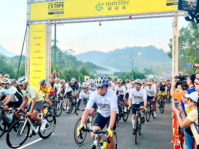People ride in the L’Etape Sun Moon Lake in Nantou County yesterday. More than 2,500 cyclists from 40 countries participated in this year’s event, a mini-series mimicking the Tour de France. It was the first time the Sun Moon Lake route was used for the event.