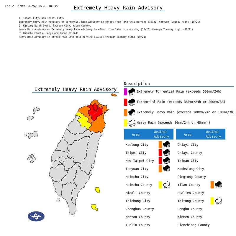 The CWA said that due to the effects of seasonal northeasterly winds and the outer bands of Tropical Storm Fengshen, it also issued heavy rain or extremely heavy rain advisories for Taoyuan, the Keelung north coast and Yilan County.