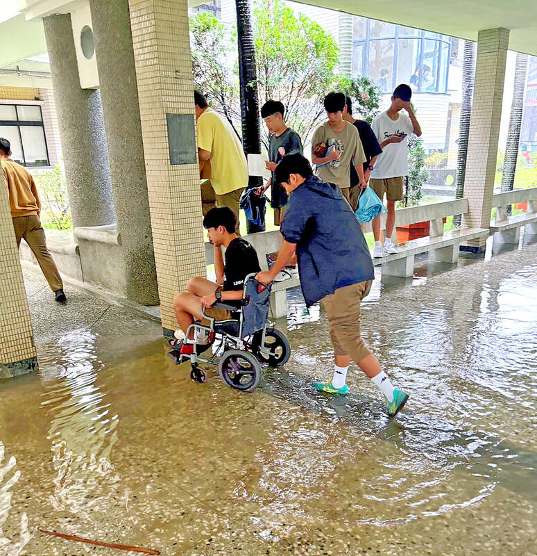 A National Luodong Senior High School student pushes another student in wheelchair through a flooded hallway yesterday. Torrential rain brought by the northeast monsoon and Typhoon Fengshen have caused flooding in the northern northeastern and eastern regions.
