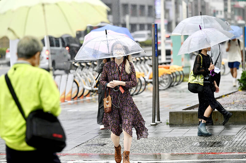 Pedestrians in Taipei shield themselves from the rain yesterday. After more than 500mm fell in mountainous areas of Taipei yesterday, rainfall is expected to intensify into tonight in northern Taiwan and Yilan County, as the low pressure system shifts south. The wet weather is not expected to ease until Saturday.