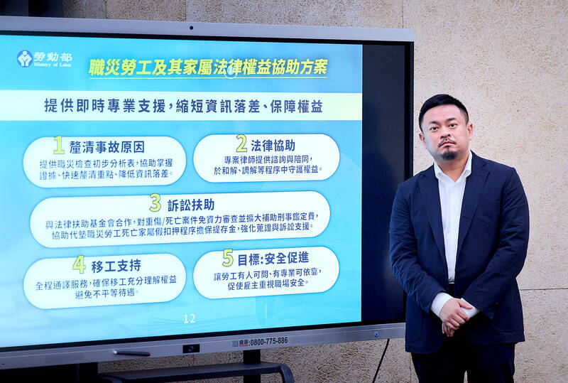 The ministry would also provide similar assistance to those in need should cases enter litigation, and incurred expenses would all be subsidized by the ministry, Labor Relations Division Director-General Wang Hou-wei (王厚偉) said.