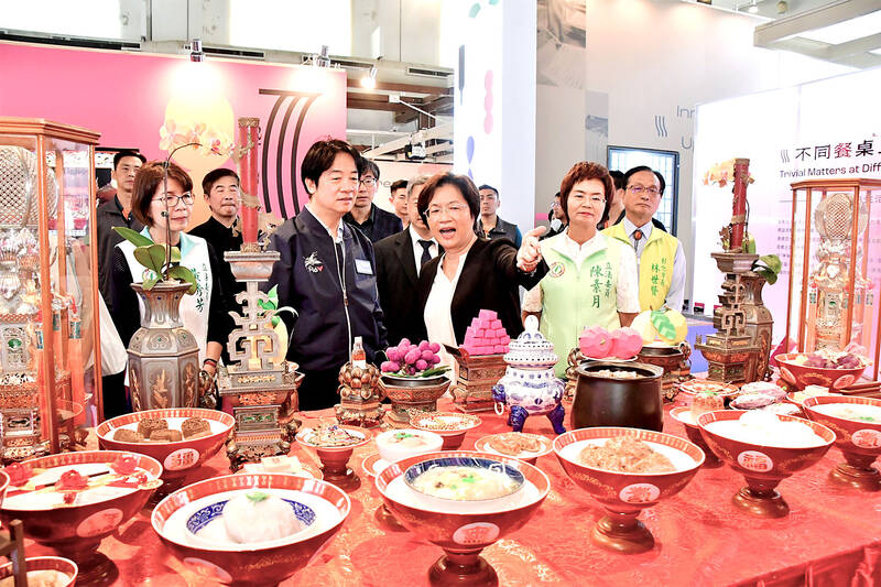 President William Lai, front row, second left, is joined by Changhua County Commissioner Wang Huei-mei, front row, second right, and Democratic Progressive Party legislators Huang Hsiung-fang, front left, and Chen Su-yu, front right, at the Taiwan Design Expo in Changhua County yesterday. Wang explained key details of this year’s exposition, held from Oct. 10 until tomorrow, including folk culture exhibitions centered around Changhua County.