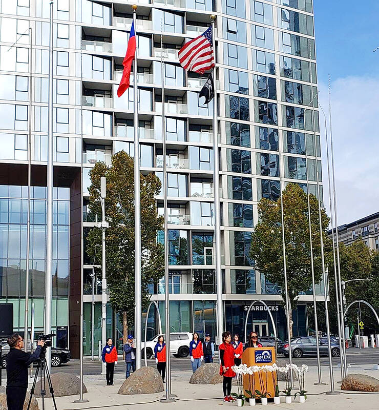 A flag-raising ceremony for the national flags of the Republic of China (Taiwan) and the US was held at the San Jose City Hall plaza, with Taiwanese expatriates and government officials attending, including San Jose City Council member Peter Ortiz.