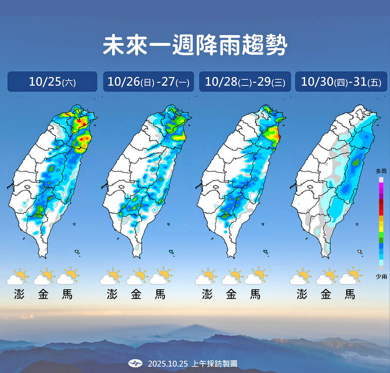 Cool and wet conditions are expected across northern Taiwan from today through Wednesday, the Central Weather Administration (CWA) said yesterday. Strengthening seasonal northeasterly winds from today are expected to keep temperatures in northern Taiwan between 21°C and 25°C for the first half of the week, the CWA said. The wind is also likely to bring rain to Keelung, Yilan County and mountainous areas in and near Taipei today, with other regions in the nation’s north and east forecast to have occasional showers, it said. Temporary showers are forecast tomorrow across eastern Taiwan and areas north of Taoyuan, with sporadic afternoon thundershowers in mountainous regions, while other areas would have partly cloudy skies, it added. Showers are expected on Tuesday and Wednesday in Keelung, eastern Taiwan, the Hengchun Peninsula and mountainous regions in Taipei and its surrounding areas, while it would be partly cloudy to clear elsewhere, it said. On Thursday, the northeasterly winds are expected to weaken, bringing partly cloudy to sunny skies across Taiwan and daytime highs of 26°C to 27°C in the north and 29°C to 31°C elsewhere, it said.