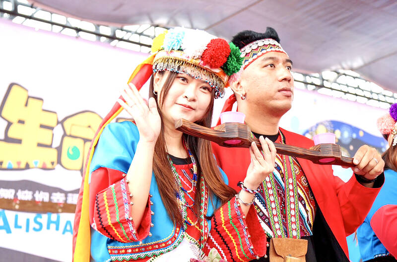 A newlywed couple in traditional Tsou indigenous clothing hold wedlock wine cups during the Akishan Tsou Fo’na Festival in Chiayi County yesterday. The festival is held annually as a collective wedding ceremony. Thirteen couples joined the festival this year.