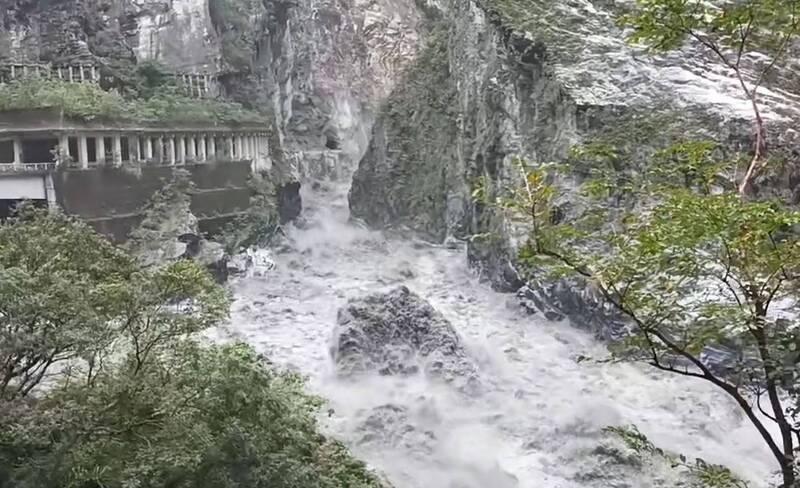 The overflow channel near Swallow Grotto (燕子口) in Taroko National Park has widened, increasing water flow and eroding the landslide dam, the Hualien branch of the Forestry and Nature Conservation Agency said today.