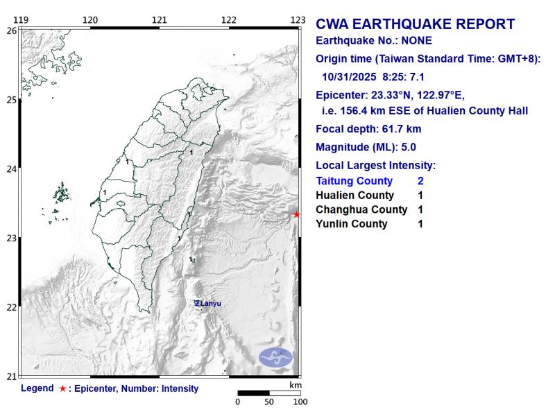 The earthquake had an intensity of 1 in Hualien, and Changhua and Yunlin counties, the data showed.