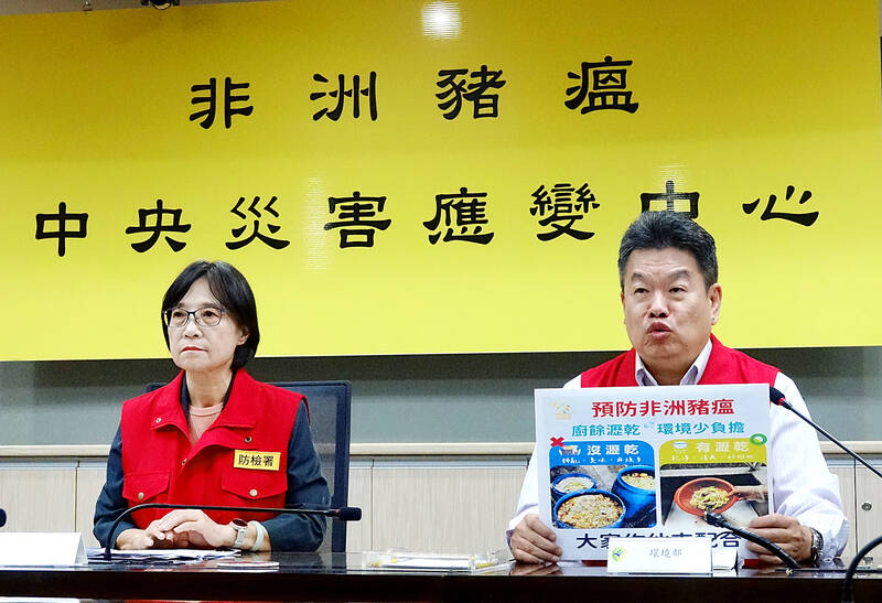 Veterinary Research Institute Director-General Deng Ming-chung (鄧明中) said the first two ASF-positive samples were collected from a swine nursery wall and waterer, while the other three samples confirmed positive yesterday were from the farm’s main entrance, inside a fridge and the steps of a kitchen waste truck.