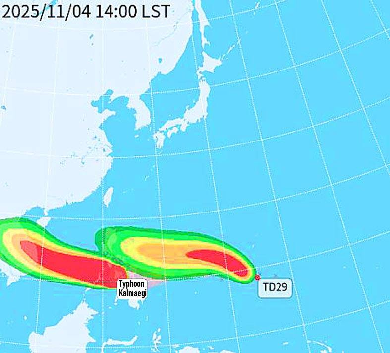 A tropical depression is expected to form into a typhoon as early as today, the Central Weather Administration (CWA) said yesterday, adding that the storm’s path remains uncertain. Before the weekend, it would move toward the Philippines, the agency said. Some time around Monday next week, it might reach a turning point, either veering north toward waters east of Taiwan or continuing westward across the Philippines, the CWA said. Meanwhile, the eye of Typhoon Kalmaegi was 1,310km south-southeast of Oluanpi (鵝鑾鼻), Taiwan’s southernmost point, as of 2am yesterday, it said. The storm is forecast to move through central Philippines before heading toward the Spratly Islands (Nansha Islands, 南沙群島) and Vietnam. It is unlikely to directly affect Taiwan. The northeast monsoon would today bring rain to the northern and northeastern regions, including Taipei, New Taipei City, Keelung and Yilan County, the CWA added.