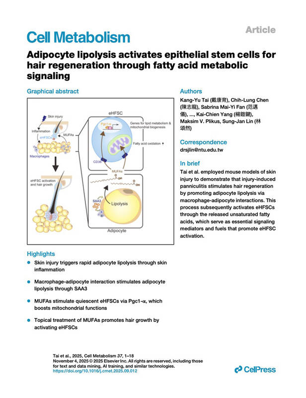 Published on Oct. 22 in the journal Cell Metabolism, the study revealed that skin injury starts a chain reaction: immune cells called macrophages signal the fat cells under the skin to release free fatty acids, which then act as fuel to reprogram the metabolism of dormant stem cells and trigger them to grow new hair.