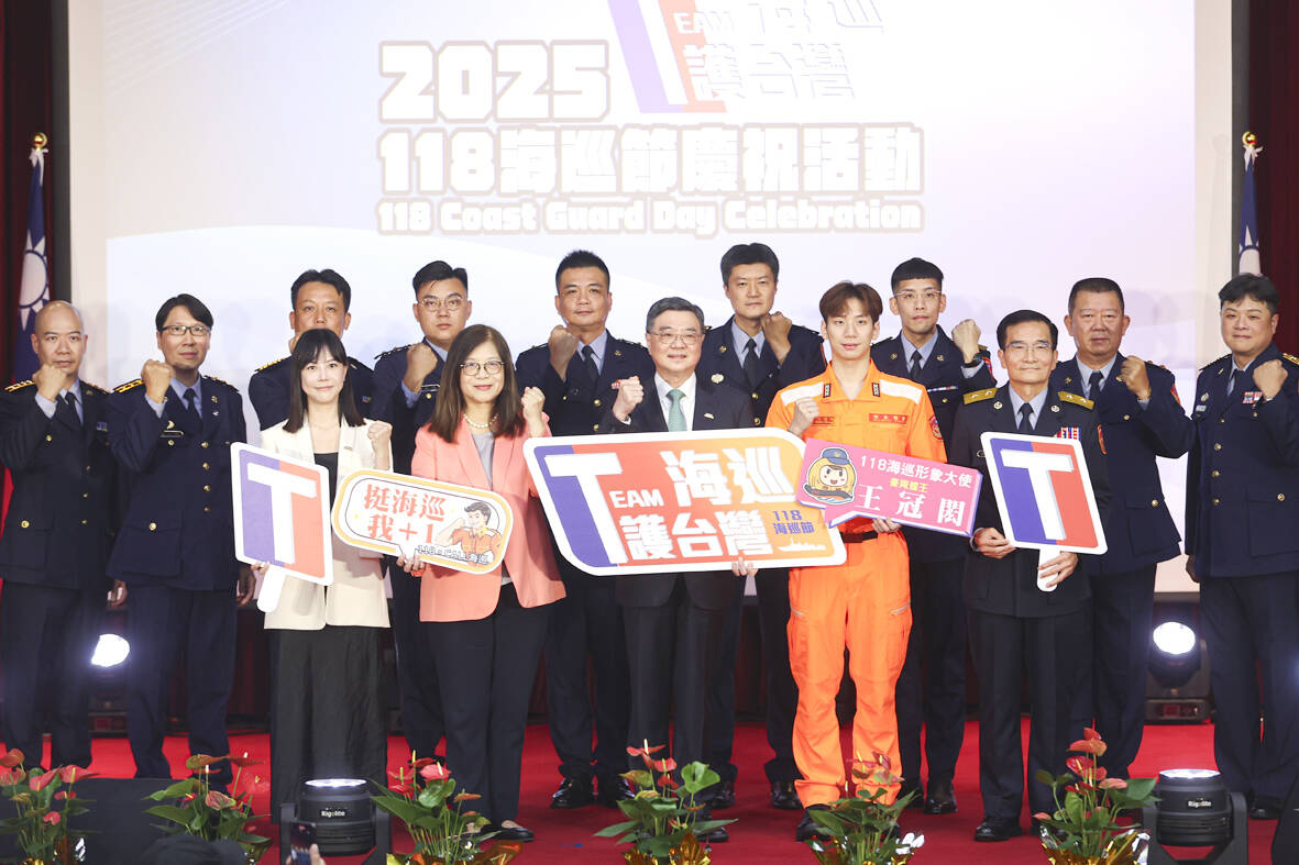 Premier Cho Jung-tai, front row, center, Ocean Affairs Council Minister Kuan Bi-ling, front row, second left, and swimmer Eddie Wang, front row, second right, gesture at an awards ceremony in Taipei yesterday honoring coast guard personnel. Wang is the image ambassador for upcoming Coast Guard Day, which is to be observed on Saturday.