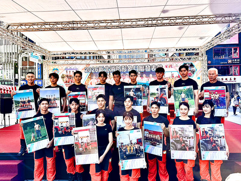 Members of the New Taipei City Fire Department who are featured in its firefighters calendar for next year hold up copies of the calendar at a promotional event in the city yesterday. The calendar is part of the city government’s efforts to promote firefighters’ public image.
