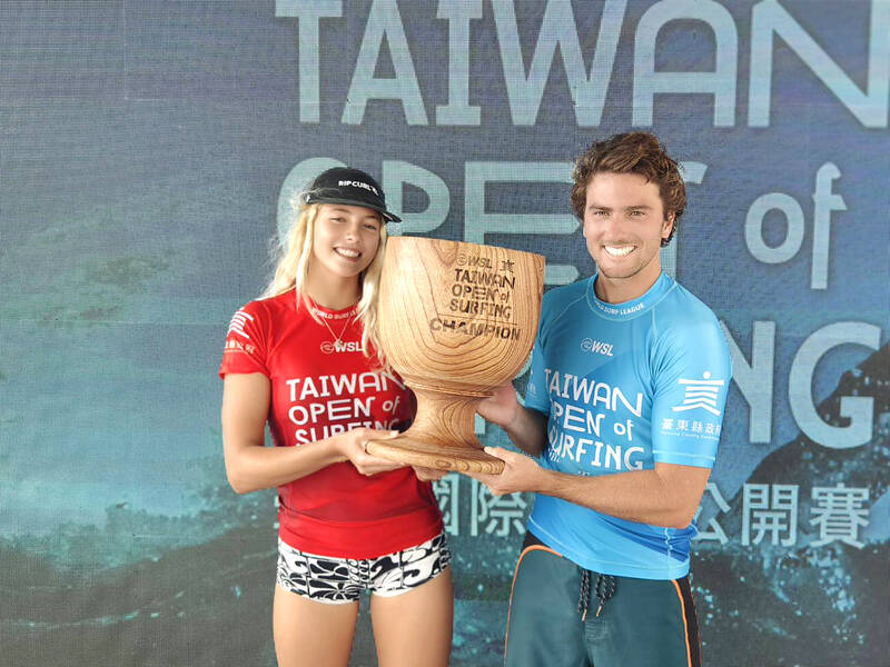 Australians Lucy Darragh, left and Reef Heazlewood pose for a photograph with a trophy after winning the championships for the women’s final and men’s final, respectively, at the Taiwan Open of Surfing, a World Surf League Qualifying Series 6000 event, in Taitung yesterday.