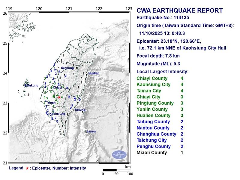A magnitude 5.3 earthquake struck Kaohsiung at 1pm today, the Central Weather Administration said.