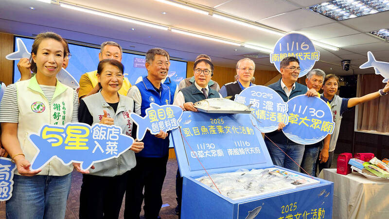 Tainan Mayor Huang Wei-che, front, fourth left, holds a fake milkfish as he poses with guests at a news conference in Tainan yesterday, promoting the upcoming Tainan Milkfish Cultural Festival. The festival’s main event takes place on Sunday, which includes a farmers’ market and educational workshops about milkfish and seafood.