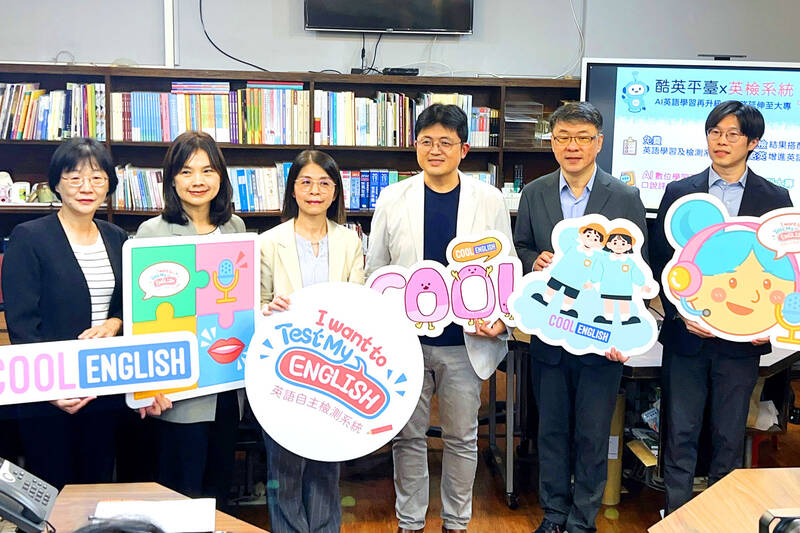 Ministry of Education officials and guests hold placards at a news conference in Taipei yesterday to promote “Cool English,” an online English-language learning platform that features a new self-assessment system. The platform incorporates artificial intelligence technology to provide resources that help students improve their speaking, listening and writing skills.