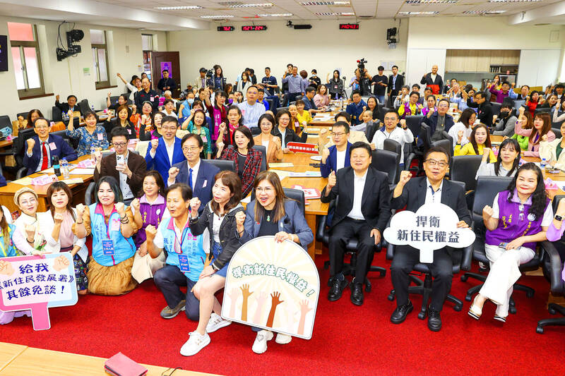 Taiwan People’s Party (TPP) Legislator Mach Ngoc Tran, front row, right, poses with fellow lawmakers from the TPP and the Chinese Nationalist Party (KMT) and “new immigrant” representatives at a news conference in Taipei yesterday, calling on the Executive Yuan to establish a “New Immigrant Development Agency” as required by the New Immigrants Basic Act the legislature passed last year.