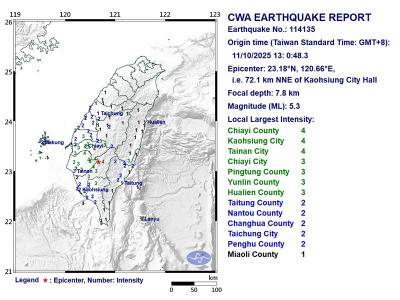 A magnitude 5.3 earthquake struck Kaohsiung at 1pm today, the Central Weather Administration said. The epicenter was in Jiasian District (甲仙), 72.1km north-northeast of Kaohsiung City Hall, at a depth of 7.8km, agency data showed. There were no immediate reports of damage. The earthquake's intensity, which gauges the actual effects of a temblor, was highest in Kaohsiung and Tainan, where it measured a 4 on Taiwan's seven-tier intensity scale. It also measured a 3 in parts of Chiayi City, as well as Pingtung, Yunlin and Hualien counties, data showed.