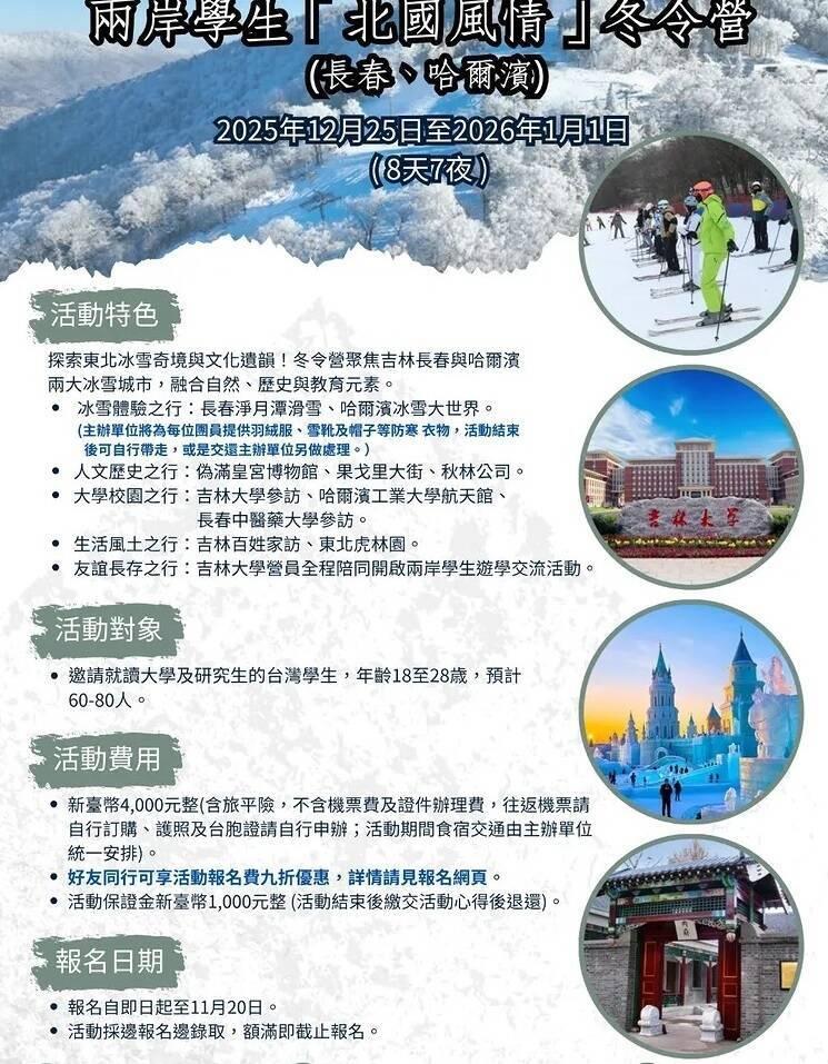 The “Cross-strait Northern Winter Camp” costs only NT$4,000, excluding airfare, with a 10 percent discount available for bringing a friend.
