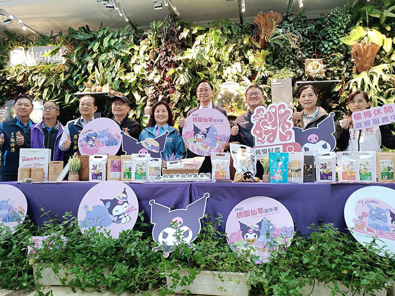 Taoyuan Mayor Simon Chang, fourth right, holds a placard along with officials from the Taoyuan Department of Agriculture at a news conference in the city yesterday, to promote this year’s Mesona Carnival. The carnival, which starts on Saturday and runs until Dec. 7, is to be held on weekends from 9am until 5pm at Taoyuan’s Yangmei Leisure Agricultural Area. Mesona, used to make grass jelly, is an herb used for dietary and medicinal purposes. The event would also showcase flower arrangements, installations featuring Sanrio character Kuromi and children’s play areas.