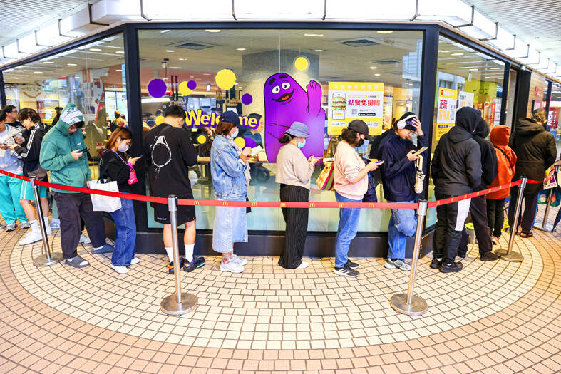 A woman from New Taipei City surnamed Hsu (徐) said that she arrived three hours early at a McDonald’s on Guanqian Road in Taipei’s Zhongzheng District (中正) that is running the promotion to secure a Grimace Fuzzy Bag and to buy four strawberry milkshakes for her family.