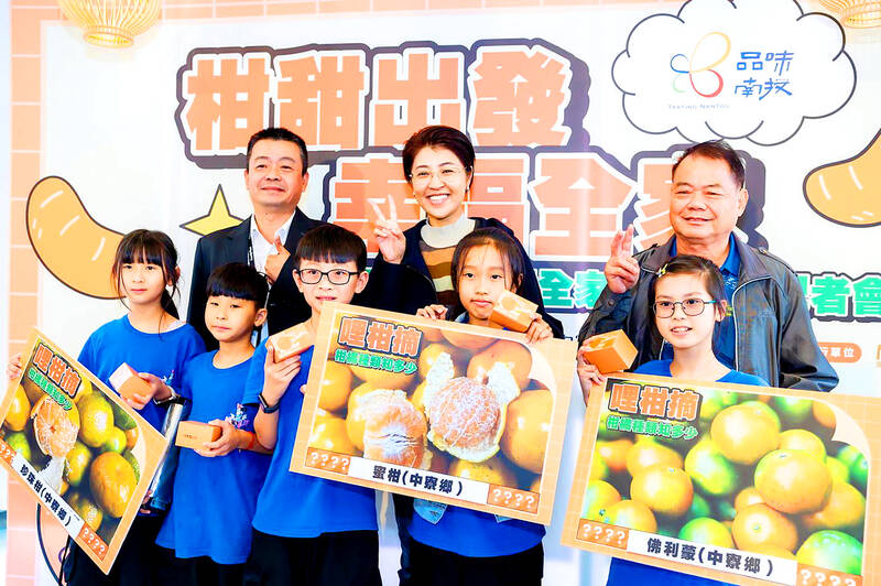 Students from Guangfu Elementary School hold placards showing oranges and tangerines produced in Nantou County’s Jhongliao Township alongside Nantou County Commissioner Hsu Shu-hua, back, center, and local farmers at a news conference in the county yesterday. The county government teamed up with FamilyMart and Yumei Food Co to allow people to buy fresh oranges and tangerines at FamilyMart convenience stores nationwide.