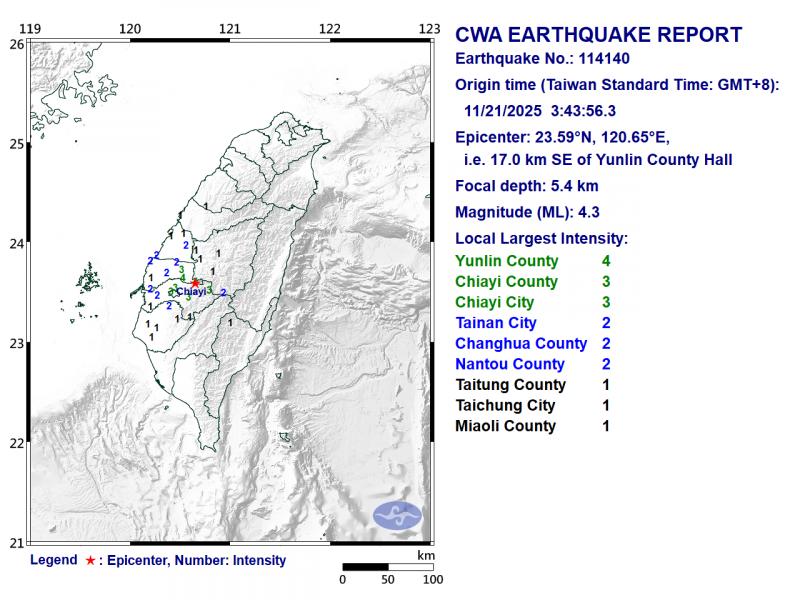 A magnitude 4.3 earthquake struck Yunlin at 3:43am today, the Central Weather Administration (CWA) said.