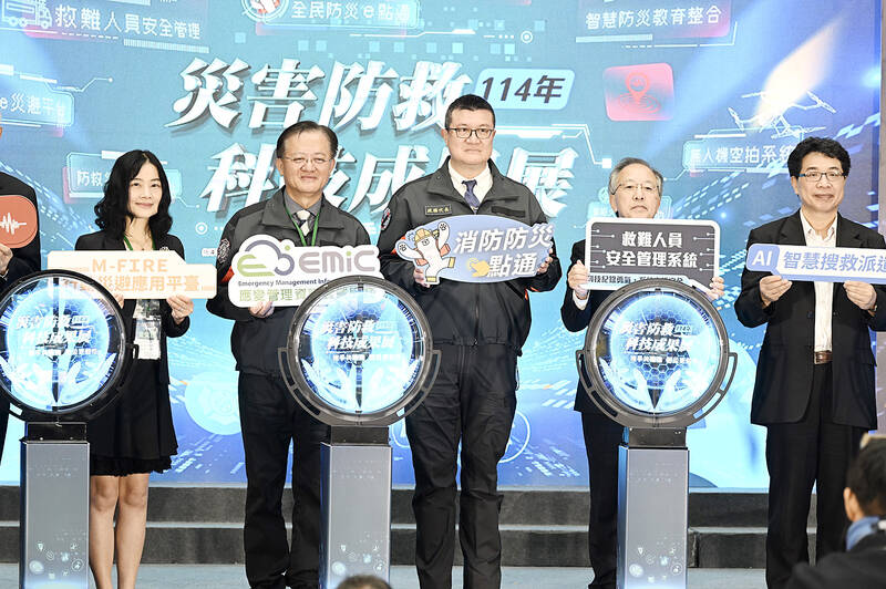 Deputy Minister of the Interior Ma Shih-yuan, third right, National Fire Agency (NFA) Director-General Hsiao Huan-chang, second left, and others hold up signs at the NFA’s Disaster Prevention and Rescue Technology Resilience Exhibition in Taipei yesterday.