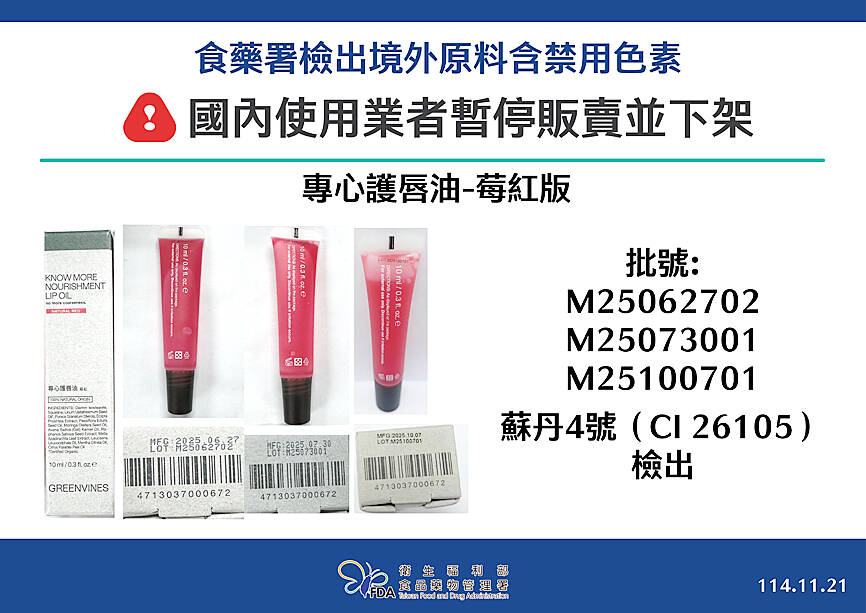 Taiwan has detected banned Sudan red dyes in cosmetics for the first time, prompting 14 local and foreign companies to recall affected products and suspend their sales.